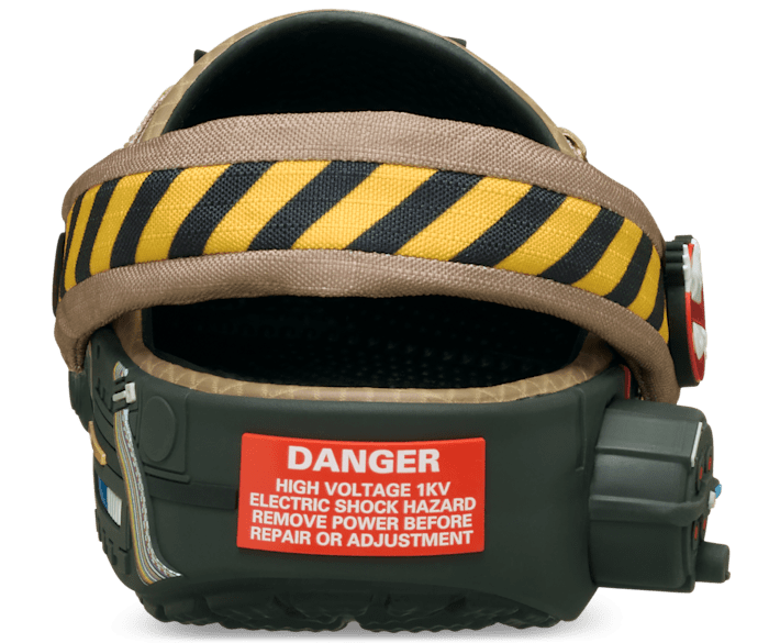 The P.K.E. meter is off the charts! Suit up and save your city from destruction in the Ghostbusters Classic Clog. Each pair is outfitted like the iconic flight suit and equipped with tools to take on the paranormal. A Ghost Trap Jibbitz™ charm and Proton Pack with touch-activated power-up sound are included on the left shoe, and Slimer sits on the right, waiting to be captured. Glow in the dark ectoplasm oozes over the toes and interchangeable name tags come with each pair so you can choose which Ghostbuster you want to be that day.