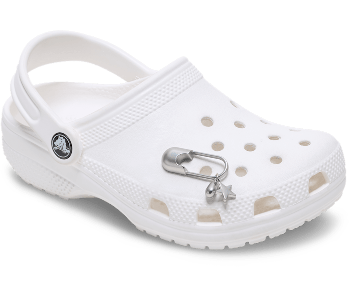 Pop some personality into your shoes with this Silver Meta Safety Pin Jibbitz™ charm. It's the perfect addition to your favorite pairs of clogs, slides, and more. Not a toy. Not intended for children under 3 years of age.
