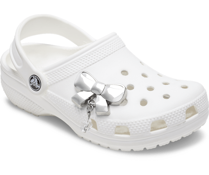 Pop some personality into your shoes with this Indie Silver Bow Dangle Jibbitz™ charm. It's the perfect addition to your favorite pairs of clogs, slides, and more. Not a toy. Not intended for children under 3 years of age.