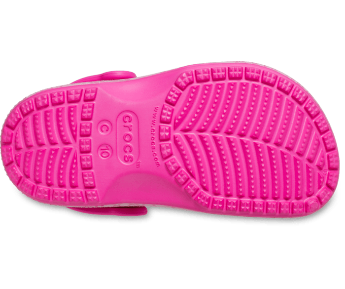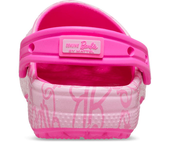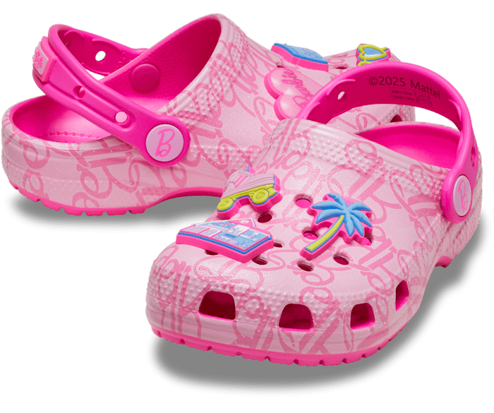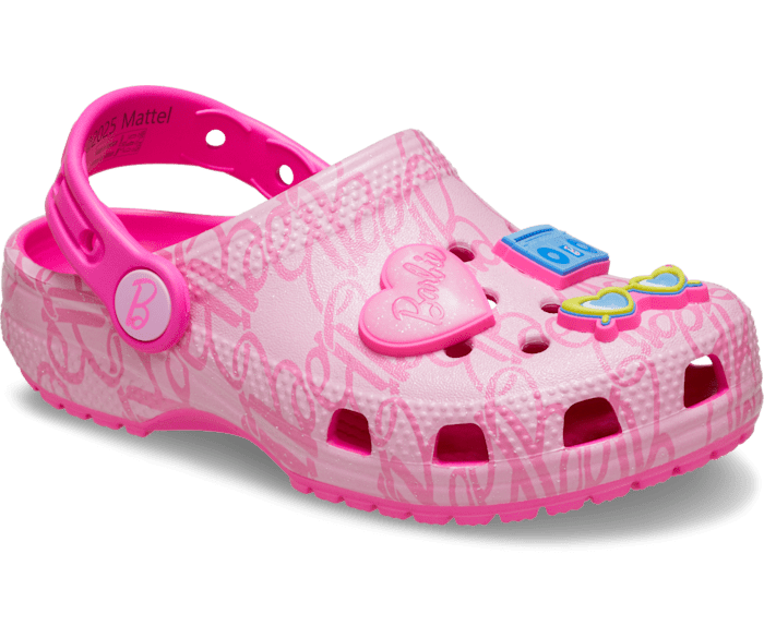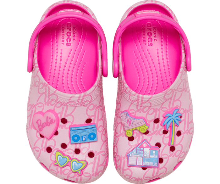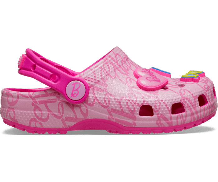 The new Barbie™ Classic Clog is the perfect statement shoe for fashion icons everywhere. This comfortably chic style comes in a pastel pink hue with a stylish all-over monogram print. Make your look shine with fixed Jibbitz™ charms featuring a Dreamhouse™ roller skate, palm tree, heart sunglasses, and Barbie™ logo.